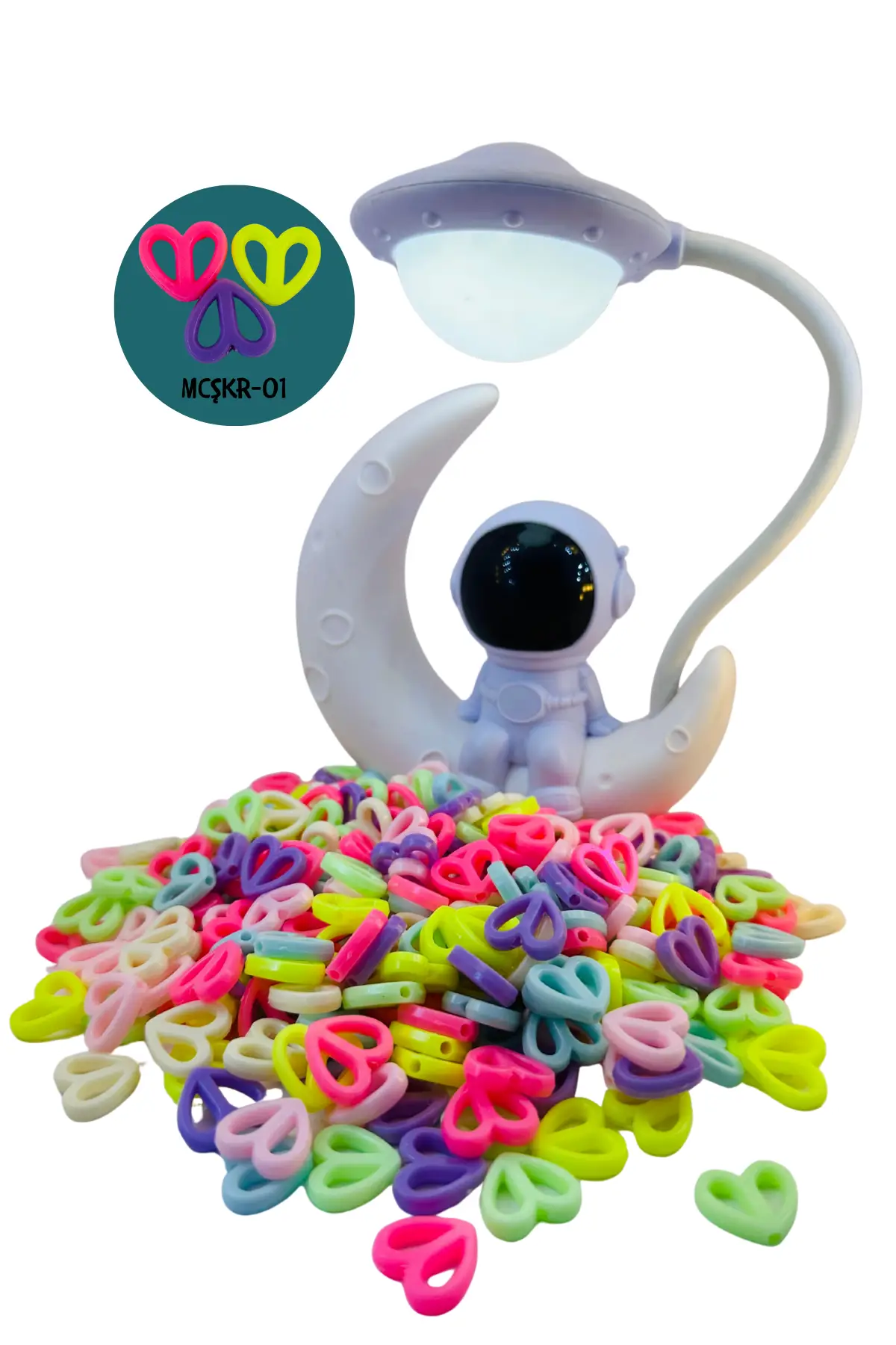 70 adet kalp figürlü şeker boncuk.; Bu figürlü şeker boncuk, kolye, bileklik, halhal ve takı yapımında kullanıma uygundur.; Çocuklar için güvenli, parlak ve canlı renkleri ile dikkat çeker.; El işi, hobi çalışmaları ve DIY projeleri için idealdir.