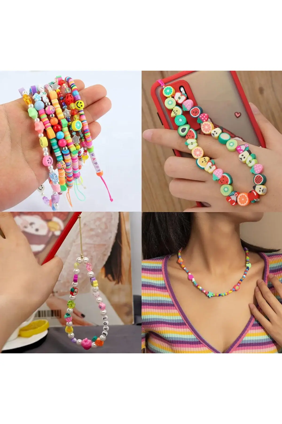 Takı tasarım malzemeleri arasında popüler olan figürlü Fimo boncuklar, elastik ip, misina ve takı telleri ile uyumludur. Çocuk takıları, yaz konseptli aksesuarlar ve eğlenceli kombinler için mükemmel bir seçimdir.